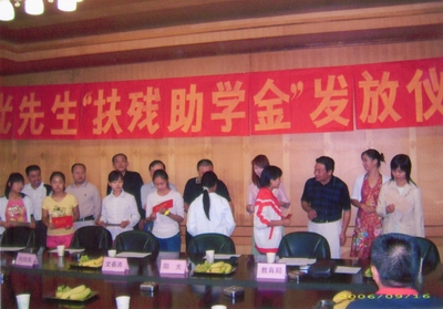 在捐贈現(xiàn)場,當(dāng)陽光先生從縣委常委、副縣長文春濤手中接過獎牌時,引起了一陣熱烈的掌聲!拔覀兿Mㄟ^陽光董事長的捐贈活動,能起到拋磚引玉的作用,引起全社會各界人士對殘疾人事業(yè)的關(guān)心和支持,形成一種有錢出錢、有力出力、有物出物,能力不分大小,重在貢獻(xiàn)愛心的良好氛圍。”文副縣長的話深深打動著大家。此次受助的殘疾學(xué)生代表陳小雷表示“我們要努力學(xué)習(xí)各門功課,以實(shí)際行動回報(bào)社會,回報(bào)陽光叔叔對我們的關(guān)愛”?粗碌暮⒆觽,陽光先生表示,凡以后考入重點(diǎn)大學(xué)的殘疾學(xué)生,愿意資助其至大學(xué)畢業(yè)。