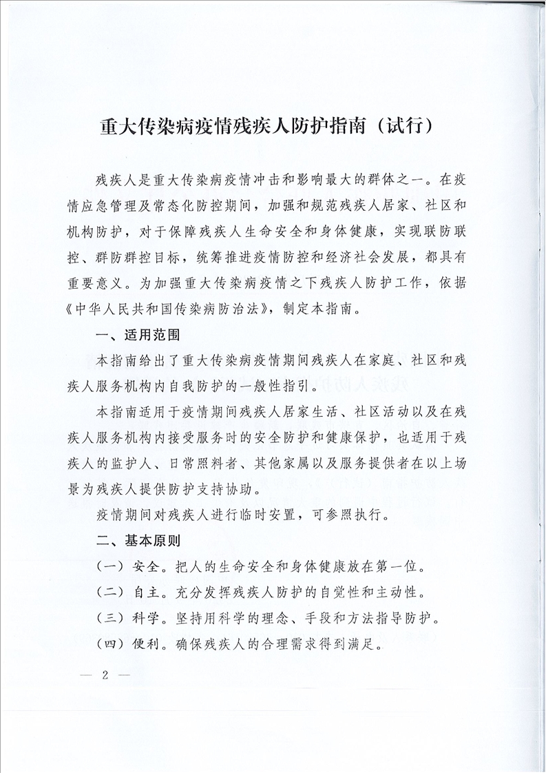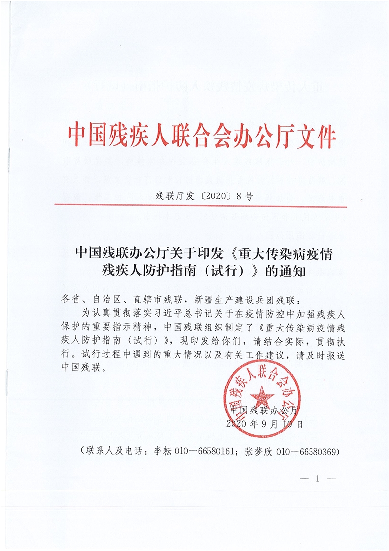 中國(guó)殘聯(lián)辦公廳關(guān)于印發(fā)《重大傳染病疫情殘疾人防護(hù)指南(試行)》的通知