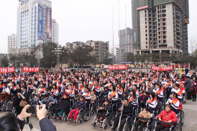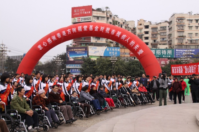 2月25日上午,由市殘聯(lián)組織的“香港方樹福堂基金向南充捐贈愛心輪椅活動”在市北湖廣場激情啟動。西華師范大學的志愿者現(xiàn)場服務,將首批領(lǐng)取愛心輪椅的200名下肢殘疾人一一攙扶上早已排列整齊的輪椅,參加啟動儀式。 市委常委、秘書長唐文金,市政協(xié)副主席胥德會,市及三區(qū)殘聯(lián)全體職工,順慶、高坪、嘉陵區(qū)政府分管領(lǐng)導及受贈親屬近900人參加了儀式。省殘聯(lián)理事、省殘疾人福利基金會理事長劉國華出席儀式并代表省殘疾人福利基金會講了話,市政府副市長張奇?zhèn)ゴ硎姓畬ο愀鄯綐涓L没鹁栀浳沂袗坌妮喴伪硎靖兄x,并表示將繼續(xù)關(guān)心殘疾人,支持殘疾人事業(yè)的發(fā)展。最后,受贈殘疾人代表蔣海平發(fā)言,感謝黨和政府及社會愛心人士幫助他們“走”出戶外,圓了行走夢。 儀式結(jié)束后,全體志愿者推著殘疾人沿順慶區(qū)文化路—育英路—人民花園的線路進行上街宣傳。參與活動的200名殘疾人個個激動不已,“我的腿受傷一年了,現(xiàn)在還在住院治療,目前只能拄著拐杖行走。我一直想要一輛輪椅,沒想到這個愿望今天終于實現(xiàn)了!奔易〖瘟陞^(qū)華山街的戴仁老人坐在新輪椅上激動地說。尤其是來自三區(qū)邊遠山村的下肢殘疾人,有的由親屬陪同,有的是各個基層殘聯(lián)工作人員相伴,前來接受輪椅捐贈。 這次由市殘聯(lián)爭取的香港方樹福堂基金為我市下肢殘疾人捐贈500輛輪椅,總價值38萬元。除了當天在現(xiàn)場捐贈的200輛輪椅外,其余300輛已經(jīng)分發(fā)到我市各縣(市),由各縣(市)殘聯(lián)轉(zhuǎn)贈當?shù)貧埣踩恕?