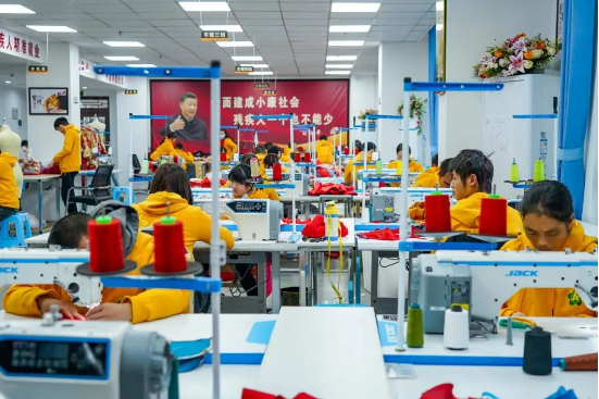 在營(yíng)山縣殘疾人創(chuàng)業(yè)就業(yè)示范基地——四川眾鑫服裝有限公司,一排排身材高挑的模特矗立在展廳,身上的中式旗袍顯得格外引人注目。在加工車間,裁剪、車縫、排花、燙珠、烙花、燙衣、質(zhì)檢、包裝各個(gè)工序有條不紊,殘疾工人們分工合作,干得熱火朝天。