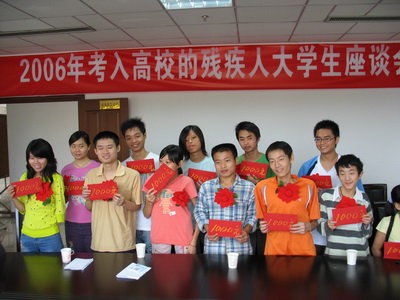 8月21日上午,全市被錄取的17名殘疾人考生來到市殘聯(lián)會議室,參加2006年殘疾人大學(xué)生座談會。市人大副主任余善衛(wèi)出席會議并講了話,他首先向同學(xué)們表示熱烈地祝賀,并鼓勵大家一是要保持平和的心態(tài)與健全人一道學(xué)習(xí);二是要保持奮發(fā)向上的精神,爭取更好的成績;三是要保持樂觀開朗的態(tài)度,不斷增強適應(yīng)社會的能力。隨后,余副主任和市殘聯(lián)負(fù)責(zé)人還為每位大學(xué)生頒發(fā)了1000元的助學(xué)金。
